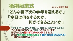 「後期の自分の姿をイメージする」、「今日、何をするのか」「何ができたらよいのか」、“やってみて、見つめ直して、考えて、またやってみる” いつの時も、失敗と書いて成長と読むという心を大切にしよう。こうした校長先生のお話を聞きながら、生徒たちは今日一日のめあてを立て、後期初日をスタートさせたことでしょう。