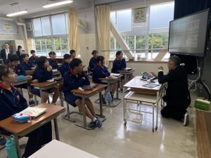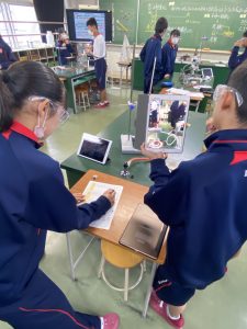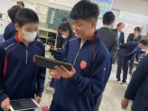 岐阜市教育委員会、議員の方々が、「ICTを活用した授業」の様子を参観されました。今回の参観授業は、3年1組国語、1年1組理科、1年2組社会の授業でした。ロイロノートに配信される画像や学習カードを参考にして、自分の意見を組み立てたり、仲間と意見交流したりする姿が見られました。また、生徒たちの回答をロイロノートのアンケート機能を活用して、AIに読み込ませ、テキストマイニングすることで仲間の意見を可視化し、前時の学習内容の復習に役立てようとする工夫もありました。議員の方々は、ICTを使って学びに必要な情報を得たり、仲間と話し合ったりと、自ら進んで学ぶ姿に興味関心を示されました。
