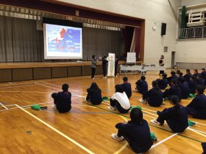 ぎふMIRAI’s講師「岐阜空襲を記録する会」による出前講座がありました。今回の参加者は2年生。岐阜空襲と戦時の子どもや中学生の生活・学校について、絵や写真、モンペパンツや防空頭巾などの具体物を使って、当時の子どもたちの様子を語っていただきました。例えば、栄養が不十分のため、今の中学生より平均身長が低く、体重が少なかったこと、甘いものが欲しくて芋のつる、トウモロコシの茎などからでる汁を吸ったことなど、生徒たちに問いかけながら話をしていただきました。また、“欲しがりません勝つまでは! 言い換えれば、勝つまでは欲しがるな”であること、戦時下では自由で多様な夢をもつことが難しいことなど、戦争の惨さを知ることができました。生徒たちは講師の方が発する言葉に真剣に耳を傾けながら、戦争のない平和な世の中の大切さを再認識することができました。