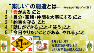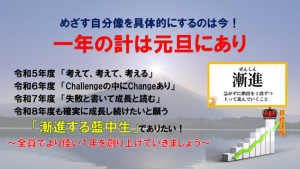 令和7年の年末の全校集会では、後藤校長先生から「文化の創造」「学びの創造」「生き方の創造」そして、「楽しいの創造」のお話がありました。令和8年となり、新しい年も「漸進する藍中生」であることを願い、めざす自分像を具体的にするのは今であるというお話がありました。「漸進する」とは、得意や好きを生かし、一歩一歩階段を上がるように確実に成長し続けることという説明もありました。生徒たちは、どんな自分になりたいのかに想いをめぐらしながら、真剣に聞くことができました。