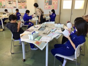 はじめに、弓型提灯に校章を貼り、その後、それぞれが思い思いのお気に入りの絵柄を描いていきました。