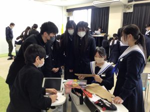 1月20日(火)、8年生は市立岐阜商業の生徒と交流しました。2月12日(木)にマーサ21で開催予定のマルシェを成功させるために、市岐商デパートで培われたノウハウを直接教えていただくためです。