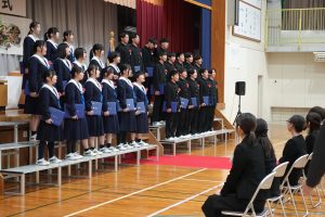 第2部では、卒業生が練習を重ねてきた合唱「友」「あなたへ」の2曲を披露しました。卒業生の中には、感極まって涙を浮かべながらも力強く歌う姿がありました。そんな姿に心を打たれ、在校生の中にも思わず涙ぐむ児童・生徒が見られました。