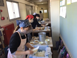 食缶からの盛り付けは、PTA本部とボランティアに手を挙げてくださった方で行いました。