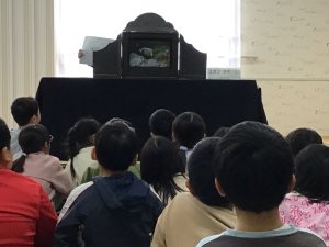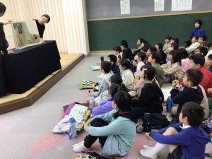 図書室では司書の方による読み聞かせをしていただきました。大型絵本と紙芝居による読み聞かせを、子供たちは真剣に見聞きしていました。
