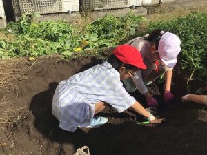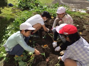 「サツマイモ」は土の中にしっかりと収まっているので、掘り出すのが大変そうでしたが、サツマイモを傷つけないようにみんなで協力して慎重に掘り出していました。ふっくらとしたサツマイモを何本か収穫することができました。
