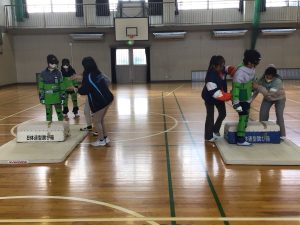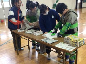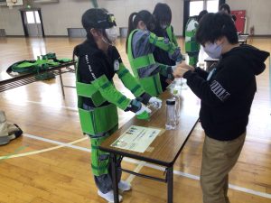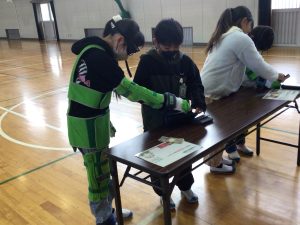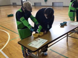 2時間目、3時間目に6年生が、高齢者体験を行いました。総合的な学習の時間で学んでいる「福祉」の一つです。身体のいろいろな部分に重りを入れ、動きにくさをつくります。手袋や特殊なメガネを付けます。二人組や三人組になって段差をのりこえることや、辞書を引くこと、ビンの蓋をあけることなどを体験しました。視野が狭くなって周りが見ずらくなること、手が思うように動かせなかったり、力が思うように入らなかったりすることを感じ取ることができたようです。高齢者の方には、どのように声をかけ、どのように手助けをするとよいのかを学ぶことができました。