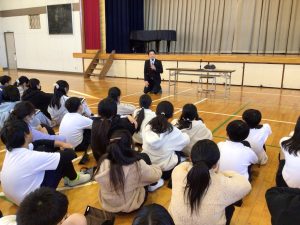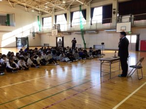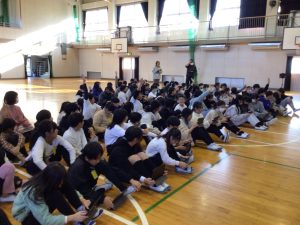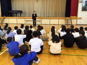 柴橋市長さんの訪問がありました。掃除の様子を見ていただいた後、1年生から4年生の授業の様子を見ていただき、5,6年生が待つ体育館へ。体育館では、市長さんからのメッセージを聞いた後は質問タイムです。残念ながら残り時間が少なく、4名の子の質問だけになりましたが、丁寧に答えていただきました。落ち着いた授業の様子や、メモを取りながら話を一生懸命聞く姿を見ていただきました。