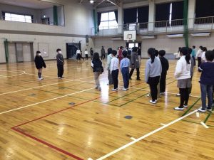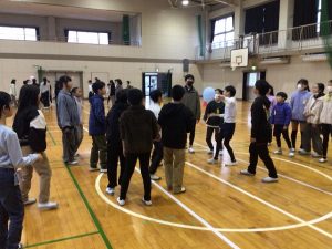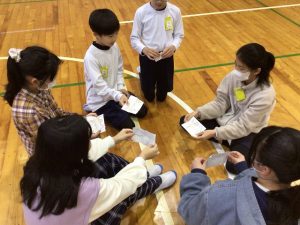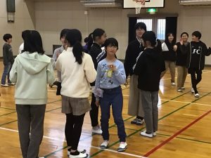 各学級の班長と執行委員がお楽しみの内容や、今日の役割などを考えたそうです。今日の会では、話す場所を考えたり、ゲームの時間を確認したりしながら進行していました。ゲームは「風船バレー」「ジェスチャーで仲間集め」「学級対抗8の字跳び」の3種類です。どのゲームも声をかけたり、相手に伝わるジャスチャーをしたりと、仲間と関わるゲームが考えられていました。
