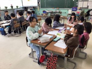 1年生 国語の学習をしていました。きつね、コアラ、ねずみなどの動物を主人公にした物語をつくります。教科書の作文の書き方にそって作文用紙に書き始めていきます。(1-1) 同じ動物を主人公にする仲間が集まって、アイデアを出し合います。(1-3) いろんな昔話があることを学んでいたところで、戦争についての質問が出てきました。先生の話に興味津々に耳を傾けていました。(1-2)