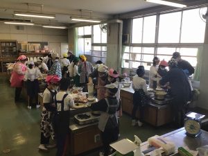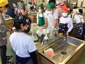 手順に添って役割を決め、グループで確認をしながら作っていました。水と大豆を入れてミキサーにかけること、鍋に入れて焦がさないようにゆっくり煮ること、木綿のふきんに入れてしぼること・・・。次々と行程を進めていました。
