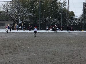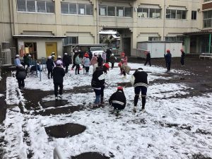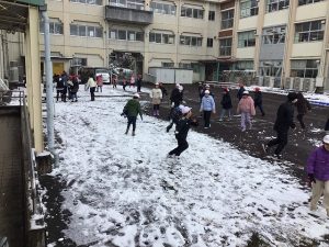 中休みになると、元気に運動場へ出てくる子供たち。雪が残っている運動場の隅や中庭では、雪遊びを始める子供たちの姿がありました。先生を見つけると、雪合戦が始まります。ターゲットは先生!先生も負けじと投げ返すのですが、子供の多さに太刀打ちできません。思わずあちらこちらへ逃げ回る先生。その先生を追いかける子供たち。笑顔がいっぱいあるほほえましい姿が見られました。