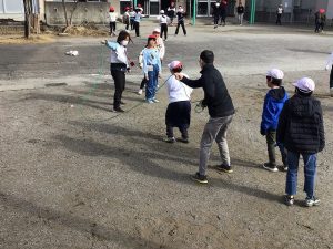 真ん中で「ぴょん」と一回跳んで上手に縄から出ていきます。中には、縄に入ると「くるっ」と体を180°回転させて跳んで上手に縄から出ていく子もいます。練習するごとに、上手になっていきます。今日は、冷たい風が吹く中休みの時間でしたが、みのりのみんなは元気いっぱいでした。