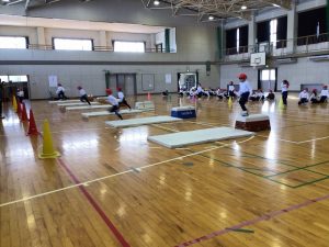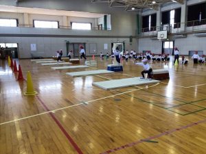 2時間目に体育館で1年生が体育の学習をしていました。体育館に跳び箱とマットがきれいに並べられ、その前には、子供たちが1列に並んでいました。先生の笛の合図で先頭の子が走り始めます。跳び箱を好きな跳び方で乗り越え、マットを好きなようにかけ抜け、コーンを回って全力で列に戻ります。跳び箱の上を乗り越える子、跳び越える子、歩いて降りる子などなど思い思いの乗り越え方をしていました。マットでは、後ろ向きになって歩く子、前回りをする子、カニ歩きをする子など、こちらもいろいろな工夫がありました。どの子も自分で考えた跳び方などで楽しそうに学習していました。