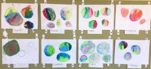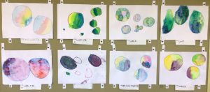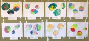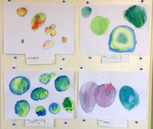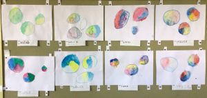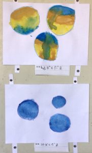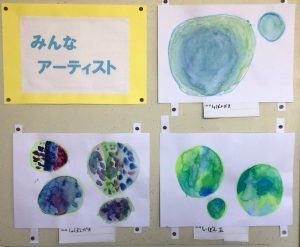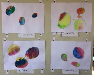個性豊かなシャボン玉がたくさん飛んでいます。図画工作の学習で絵具の使い方を学びます。水の量によって色の濃さが変わることを生かして、薄い色や濃い色のシャボン玉が出来上がります。どの色とどの色を混ぜるとどんな色になるかな?色の変化を楽しみながら描きました。