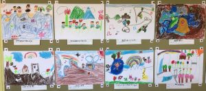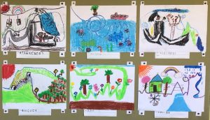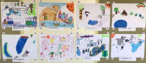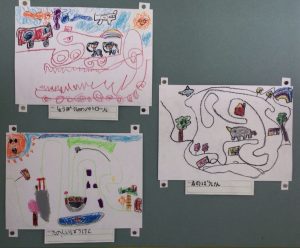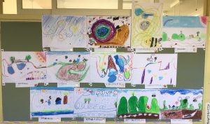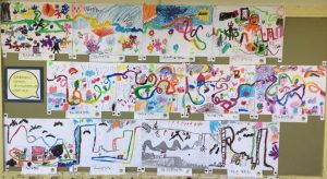 図画工作の「せんのぼうけん」の学習です。かくかく、にょろにょろ、でこぼこなど、描いた線から冒険を考え、描き上げた作品です。見ていると、いろいろな冒険があります。隣の絵とつながっている冒険もあります。わくわくが広がって見ていてとっても楽しいです。