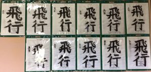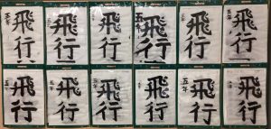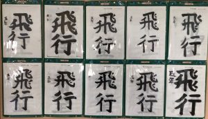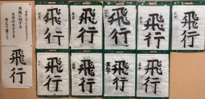 書写の学習で書いた毛筆「飛行」です。「用紙にあった文字の大きさ」ということで、用紙に対する文字の大きさを考えて書く学習です。「飛」は画数も多く「とめ、はね、はらい」の全てが含まれている文字ですが、意外と書きやすい文字かもしれません。「行」は五画と画数は少ないのですが、こちらも「とめ、はね、はらい」が全て含まれています。空間が多いので、バランスをとるのが難しい文字かもしれません。