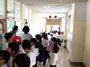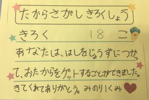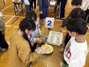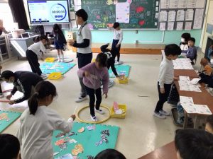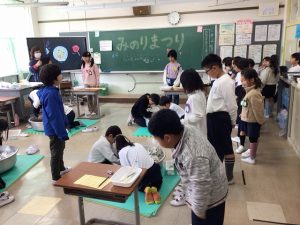 中休みに、みのりまつり(低学年)が開催されました。1組は、「おはしでさがせ 新聞宝さがしゲーム」を 2組は、「さかなつりゲーム」をそれぞれ考えました。この日はとても大賑わいで廊下には遊びにきた低学年の子供たちでいっぱいでした。それぞれの学級では、任された担当の仕事をしっかりと行うみのり学級の子供たち。説明してもらったルールを守りながら遊ぶ低学年の子供たち。みんなが楽しそうに遊んでいる姿が見られました。1組のゲームは、2種類の長さの菜箸が用意されていて、自分で選び新聞の下に隠れている宝物を探して、菜箸でつまむというものです。宝物は、ピンポン玉やガラスでできた小さな置物、プラスチックのかわいらしいおもちゃなどです。これがなかなかつまめない!そこが、楽しいゲームです。2組は、割りばしの先についた磁石で魚を釣るゲームです。魚は全て2組の子供たちが作成しました。自分の身長ほど長い魚がいるかと思うと、反対にとっても小さな魚がいたり、色とりどりの魚や、創作の魚などたくさんの魚がいました。1組も2組も、いくつとれたかの記録賞や参加賞の(子供たちがデザインした)シールも準備されていました。今後、中学年と高学年が遊ぶ計画されています。きっと大盛況になることでしょう。