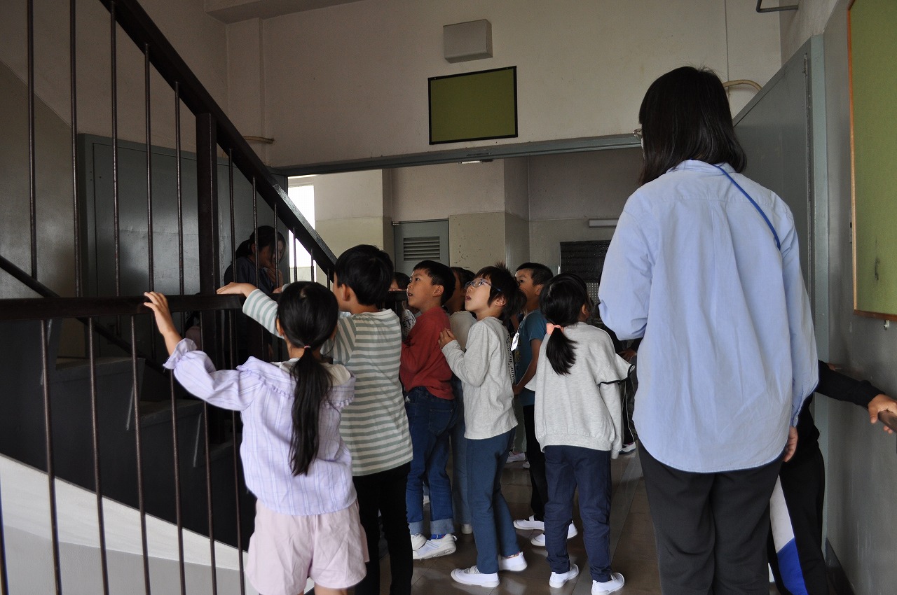 その1年生は生活科で校舎たんけんをしていました。梅林小学校校舎の???のひとつ、行き止まりになる階段を見ています。