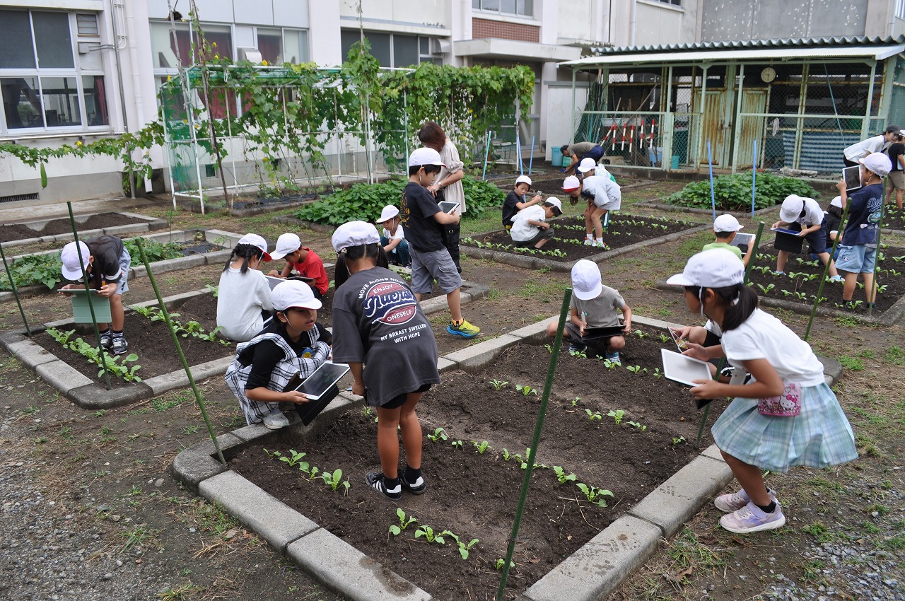2年生生活科。先日まいたダイコンの種が発芽し、子葉から葉も出てきました。見たり、触ったりしながら新しい発見をしています。