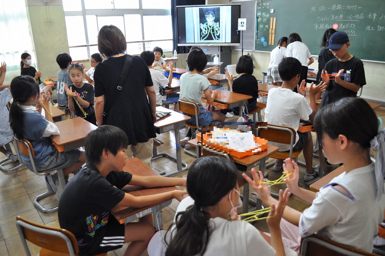 5年図工「木版画」。昨年度の5年生(現6年)の作例を見ながらイメージを膨らませ、あやとりの決めポーズを考えています。