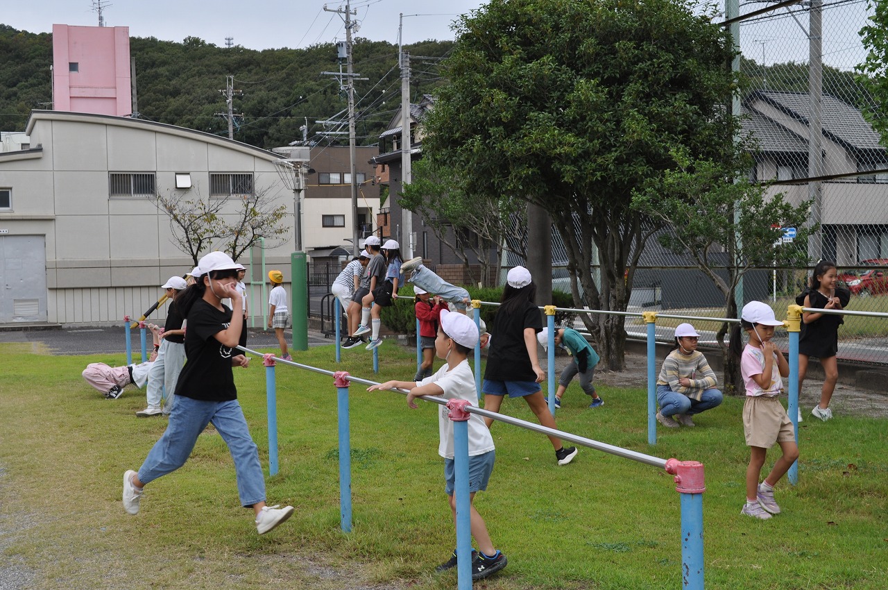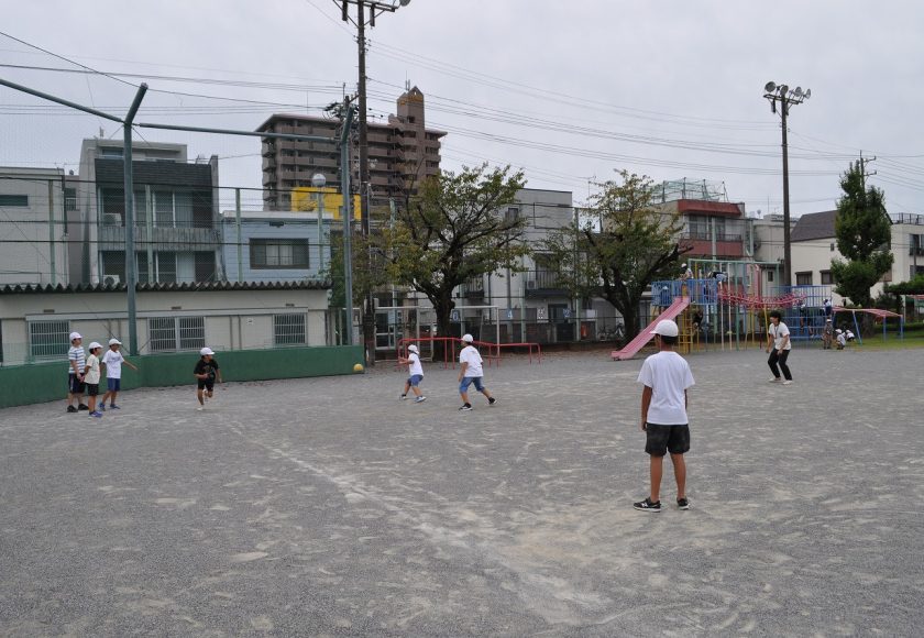 曇天の中、ハッピータイムは今日もみんな元気に外でからだを動かしていました。
