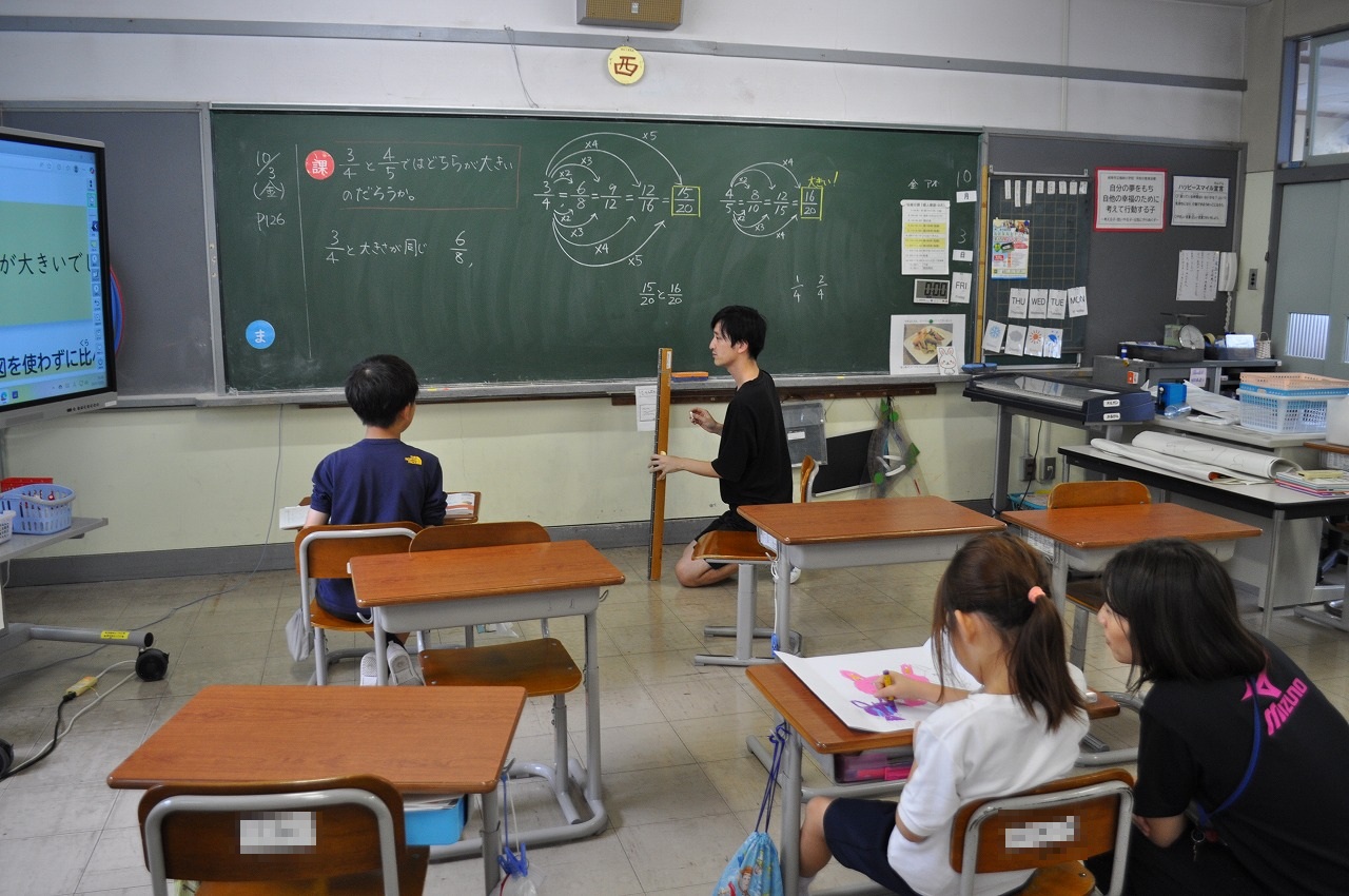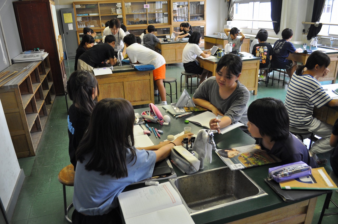 6年理科「大地のつくり」。梅林小学校の地下のようすについて調べています。校舎建築時に行ったボーリング調査のサンプルを見ながら、れき、砂、どろがどれくらい含まれているか確かめています。