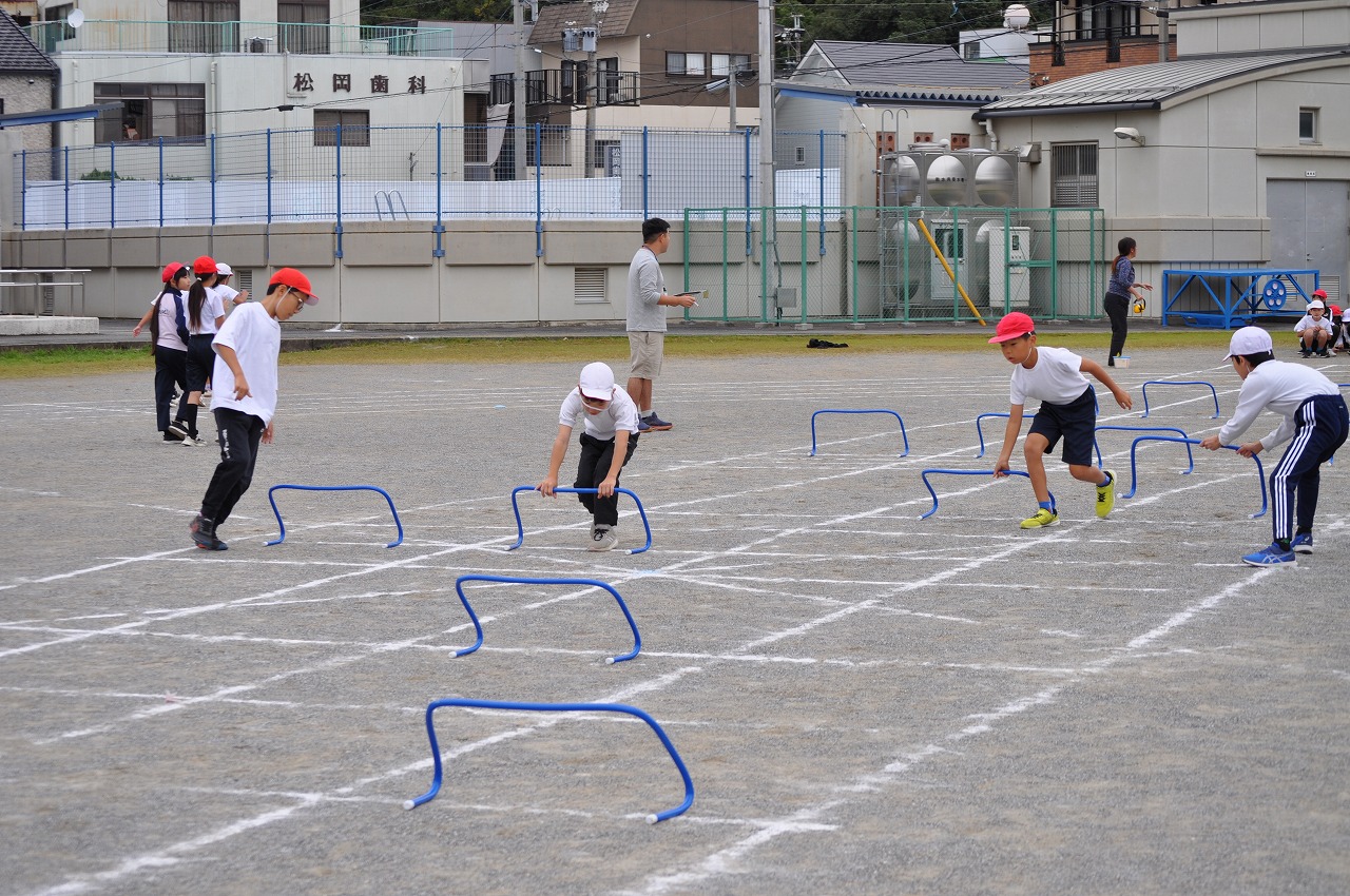 4年生は5年生と同じコースでミニハードルを跳び越します。こちらもハードル間の距離は一人ひとり異なります。4年生も5年生もハードル位置の変更は自分たちで行っています。