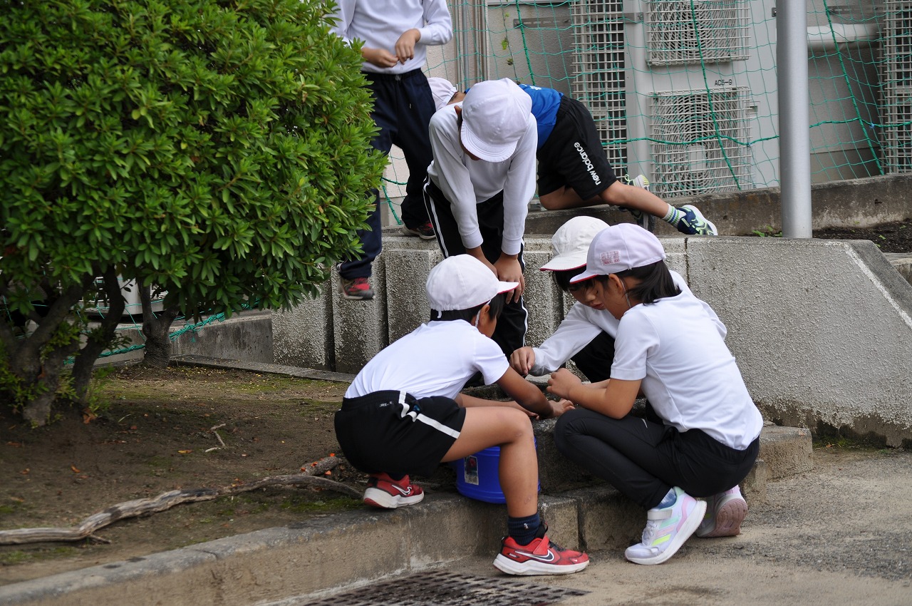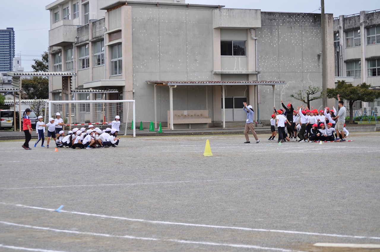 3,4年団体種目「うめっこタイフーン」です。団ごとに作戦を考えて練習しました。最後に練習試合を行いました。どちらの団も勝ちたいという気持ちが動きや応援の声に表れていました。今日は赤団が勝ちました。練習でしたが喜び方も全力でした。本気で取り組んでいる様子が伝わりました。