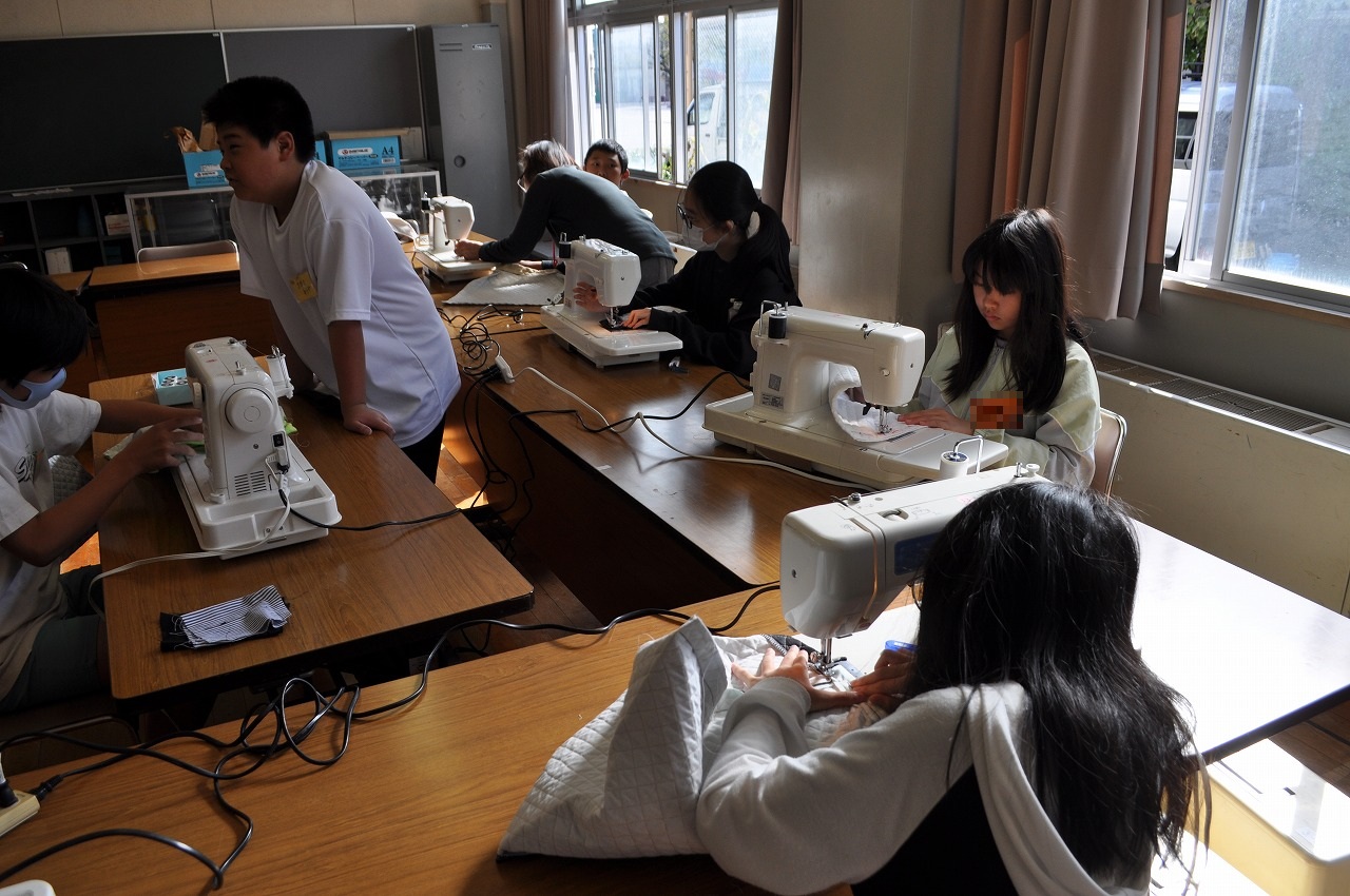 6年生家庭科「トートバッグづくり」。ミシン縫いには毎回ボランティアの方に支援していただき大変助かっています。ありがとうございます。