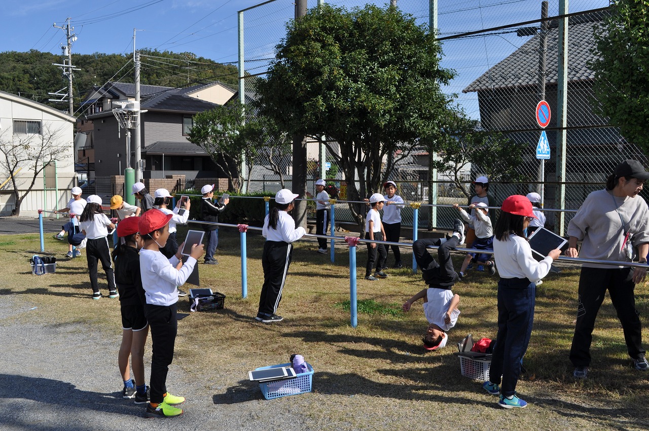 3年体育「鉄棒」。運動会が終わると鉄棒の取組が行われます。タブレットを活用して自分の技を撮影してもらい、確認しています。