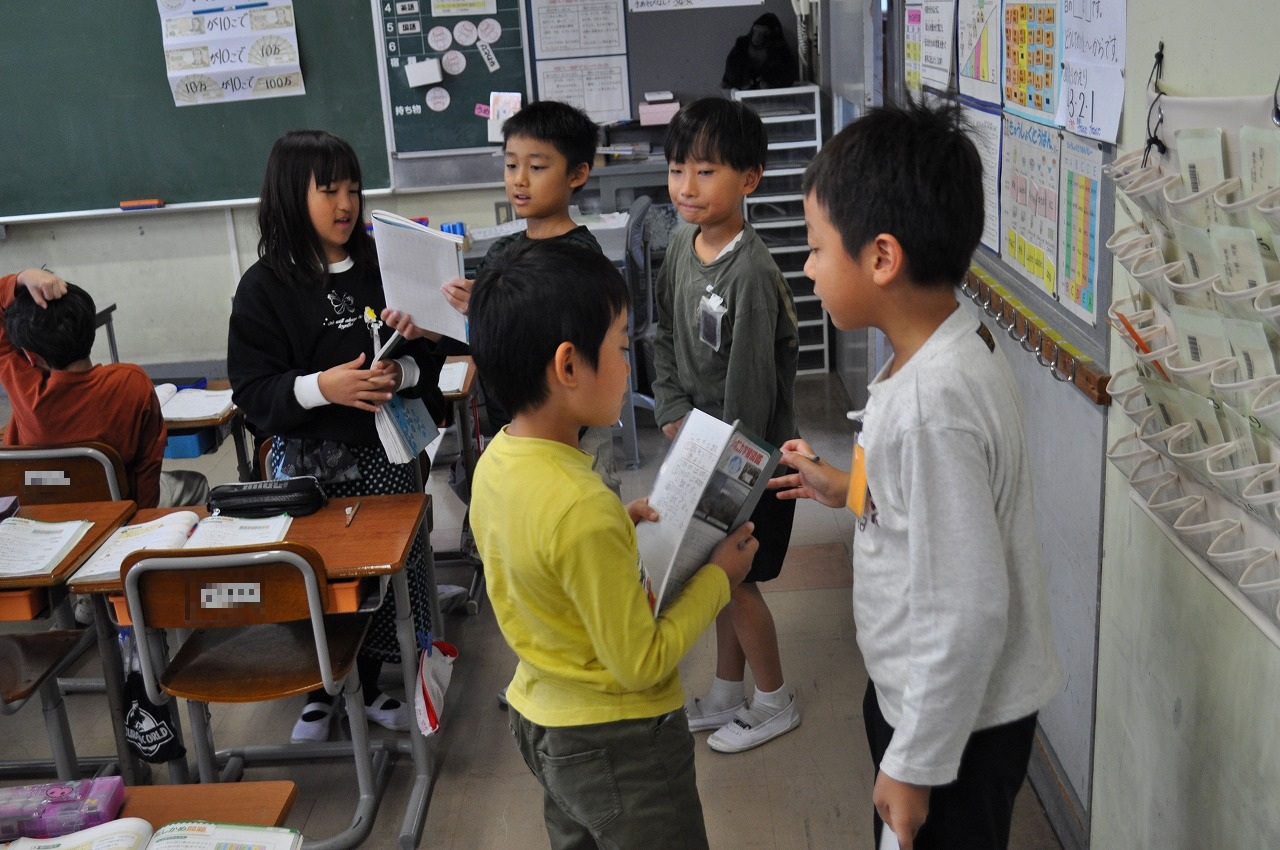3年生算数。子どもたちが自由に席を移動して交流しています。自分たちで学び進めていこうとしていますね。