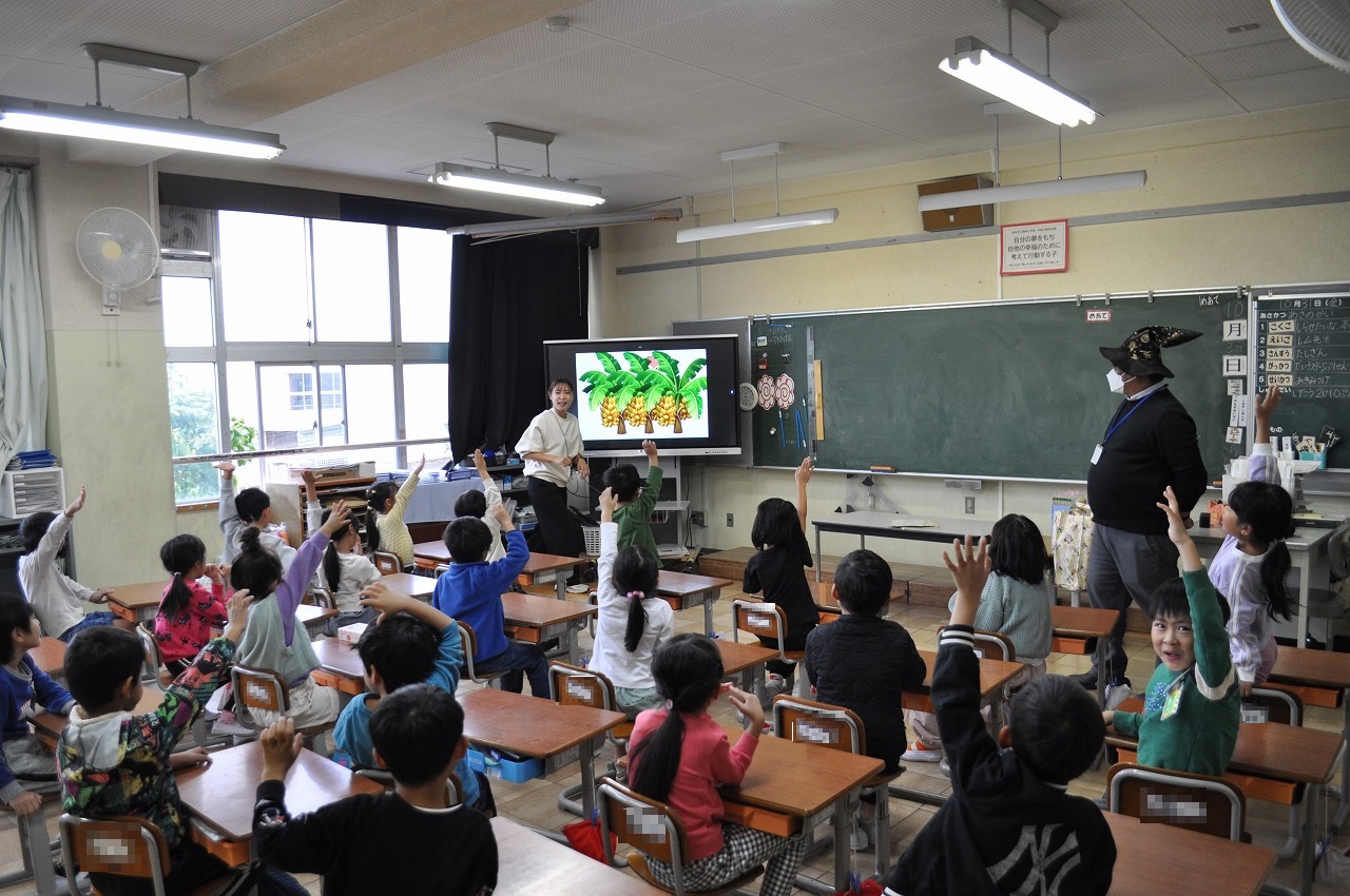 1年生外国語活動では、ALTさんがハロウィンの仮装をしていました。