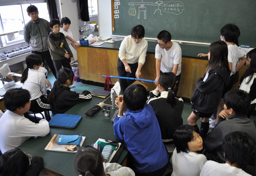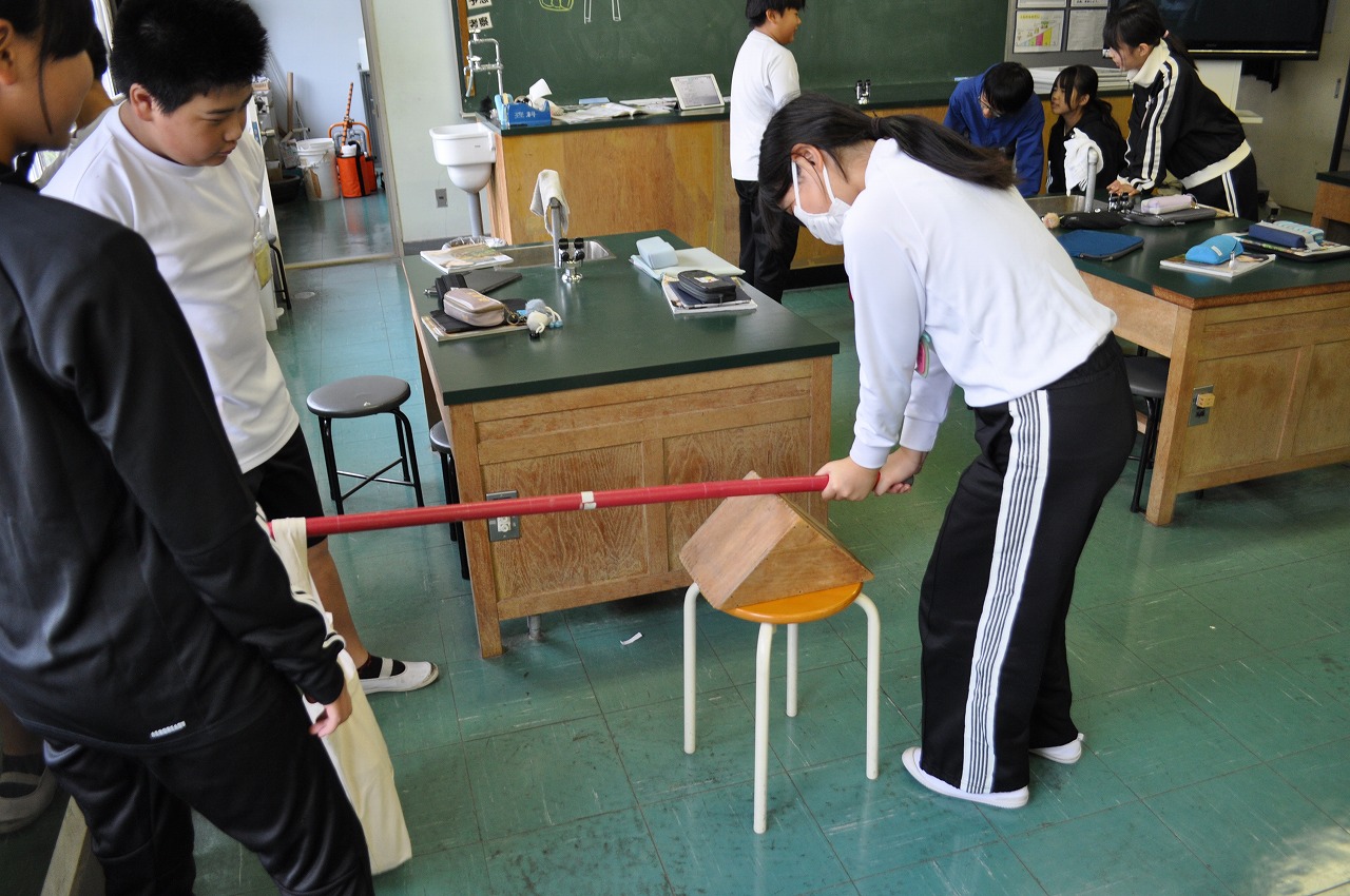 6年生理科「てこのはたらき」。道具を使って楽に荷物を持ち上げる方法を考えています。今日は「てこ」とそれに関する用語「支点」「力点」「作用点」を学習し、小さな力で持ち上げることのできる方法を見つけていました。