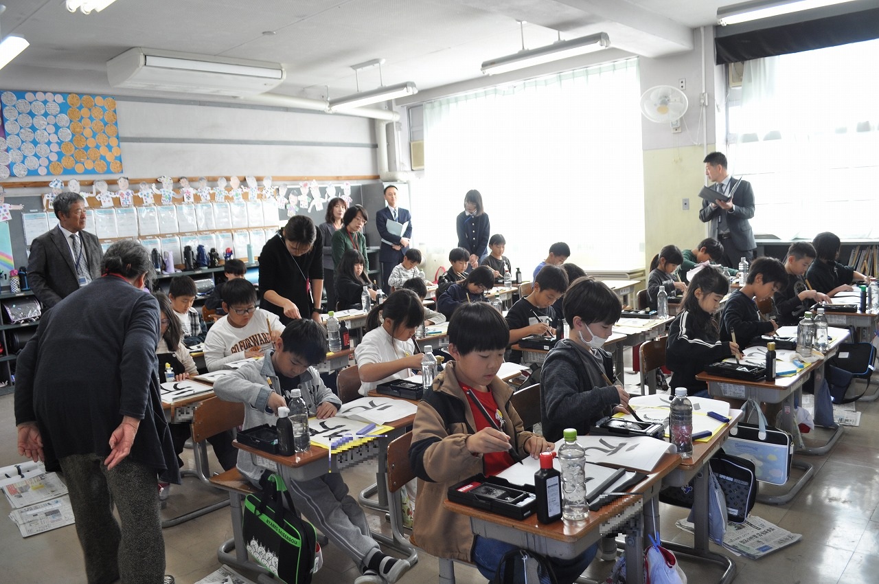 3年生書写「毛筆」。今日はボランティアの方も複数支援に入っていただきました。