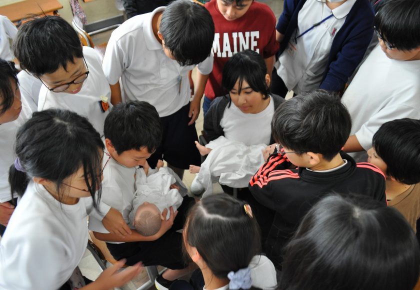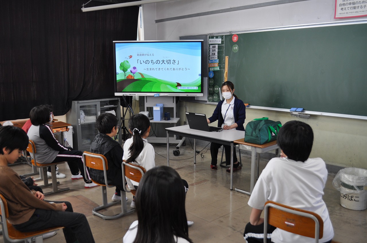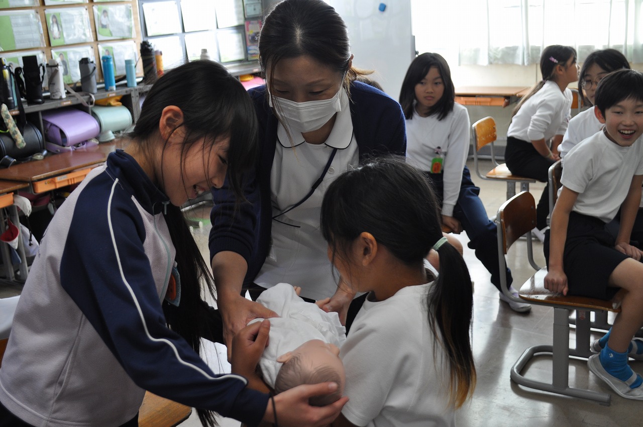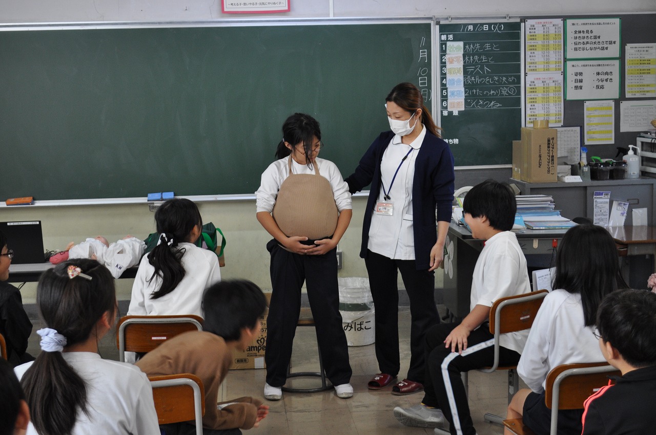岩佐マタニティの助産師さんを講師にお招きし、いのちの授業を行いました。助産師の仕事について教えてもらった後、胎児が成長していくようすを教えていただきました。