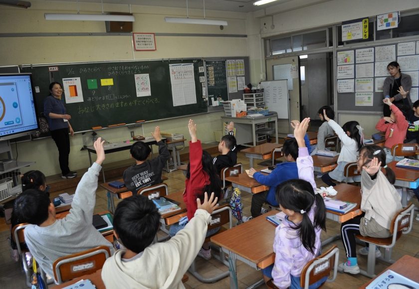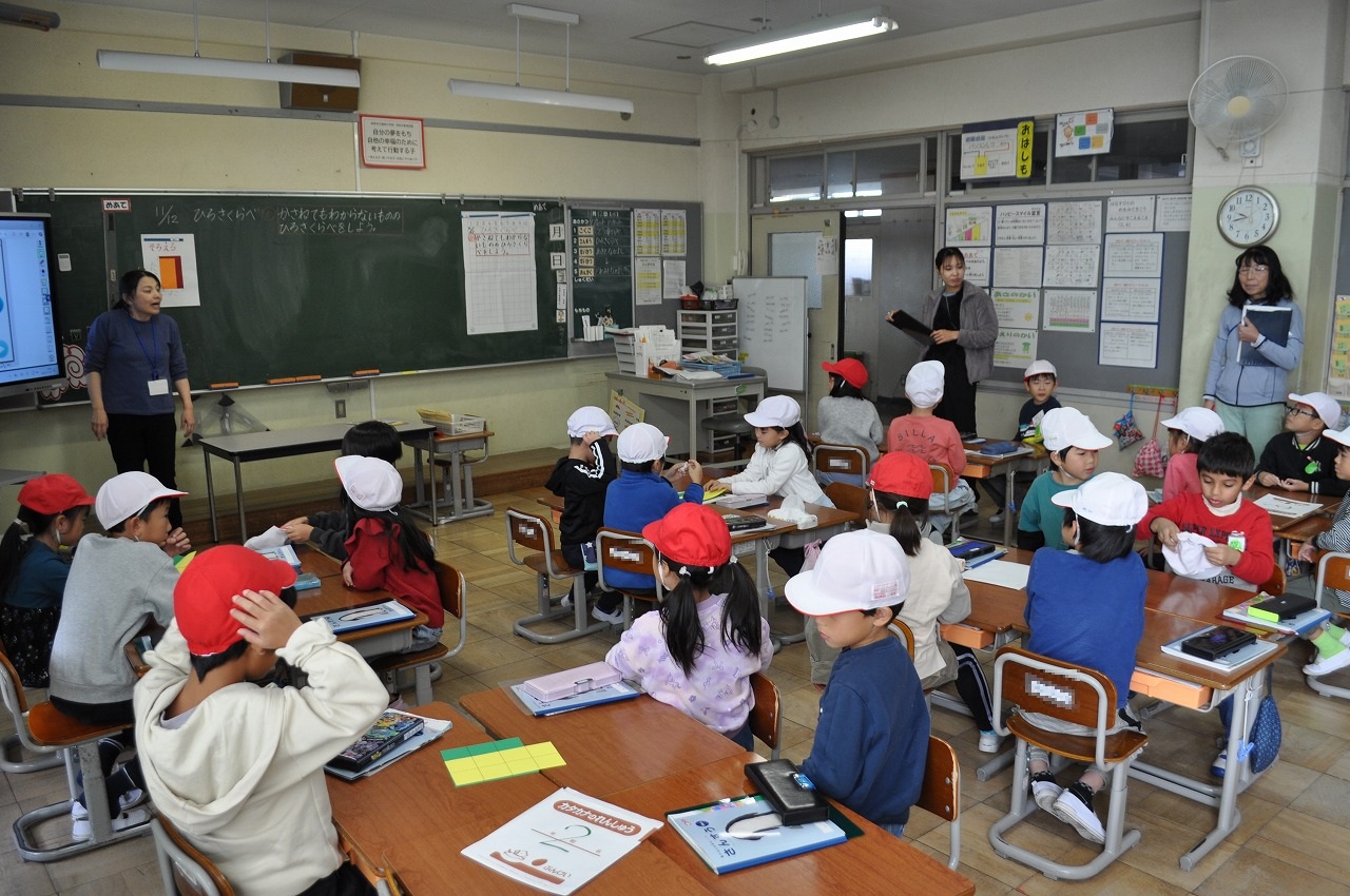 1年生が算数の研究授業を行いました。「ひろさくらべ」の2時間目です。そろえて比べられない場合の広さをどう比べるか考えます。困っている子も自分で帽子の色を変えて示していました。わかりたいという気持ちが伝わってきます。