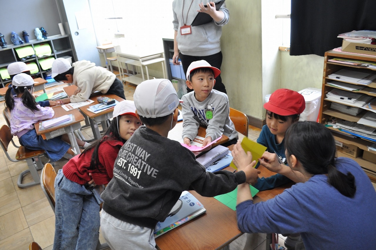 グループで考えを交流していくうちに、帽子の色が変わっていく子もいました。同じ広さのいくつ分なのかで2つの形の広さを比べることができることを発見することができました。最後は自分のペースで問題に挑戦して終了。じぶん学び、なかま学びの姿がたくさん見られました。