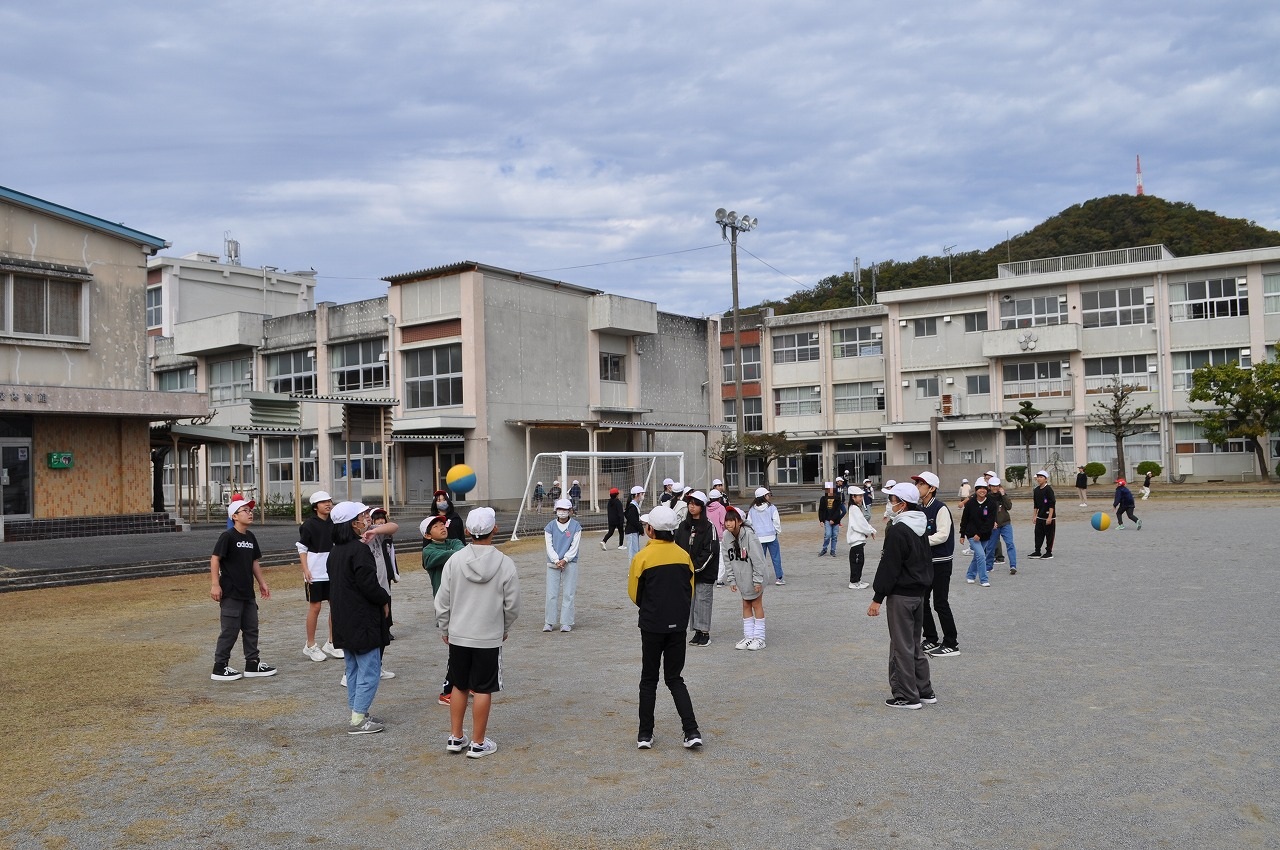 寒空の下でしたが、ハッピータイムには外に出て元気にからだを動かしていました。6年生は体育でも行っているソフティバレーの円陣パスが流行っているようです。