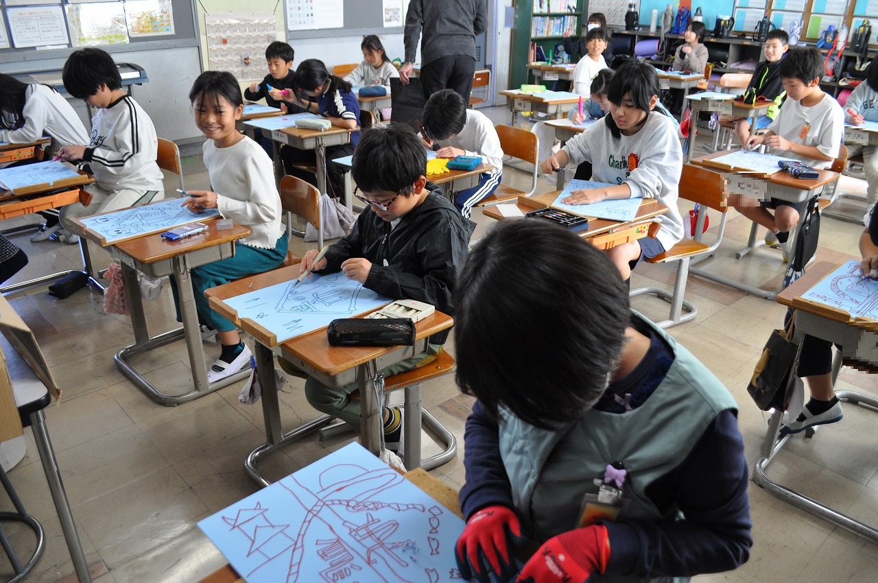 4年生は図工で版画を取り組んでいます。彫刻刀を使って彫り始めました。字は鏡文字にしなくてはならないので下書きが大変そうです。