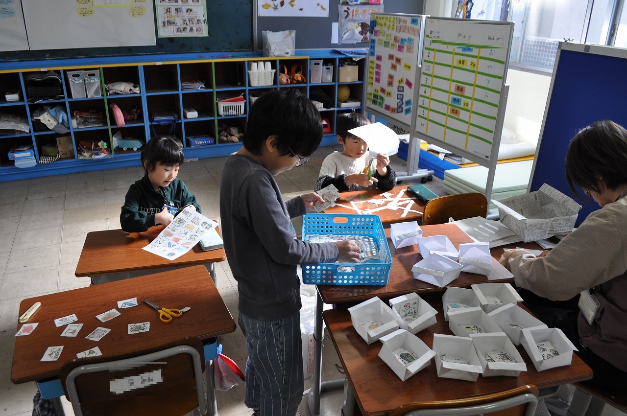 なかよし学級がぽかぽかウィークの取組準備を行っていました。線の上をはさみで切ったり、同じデザインの紙を集めたりしていました。
