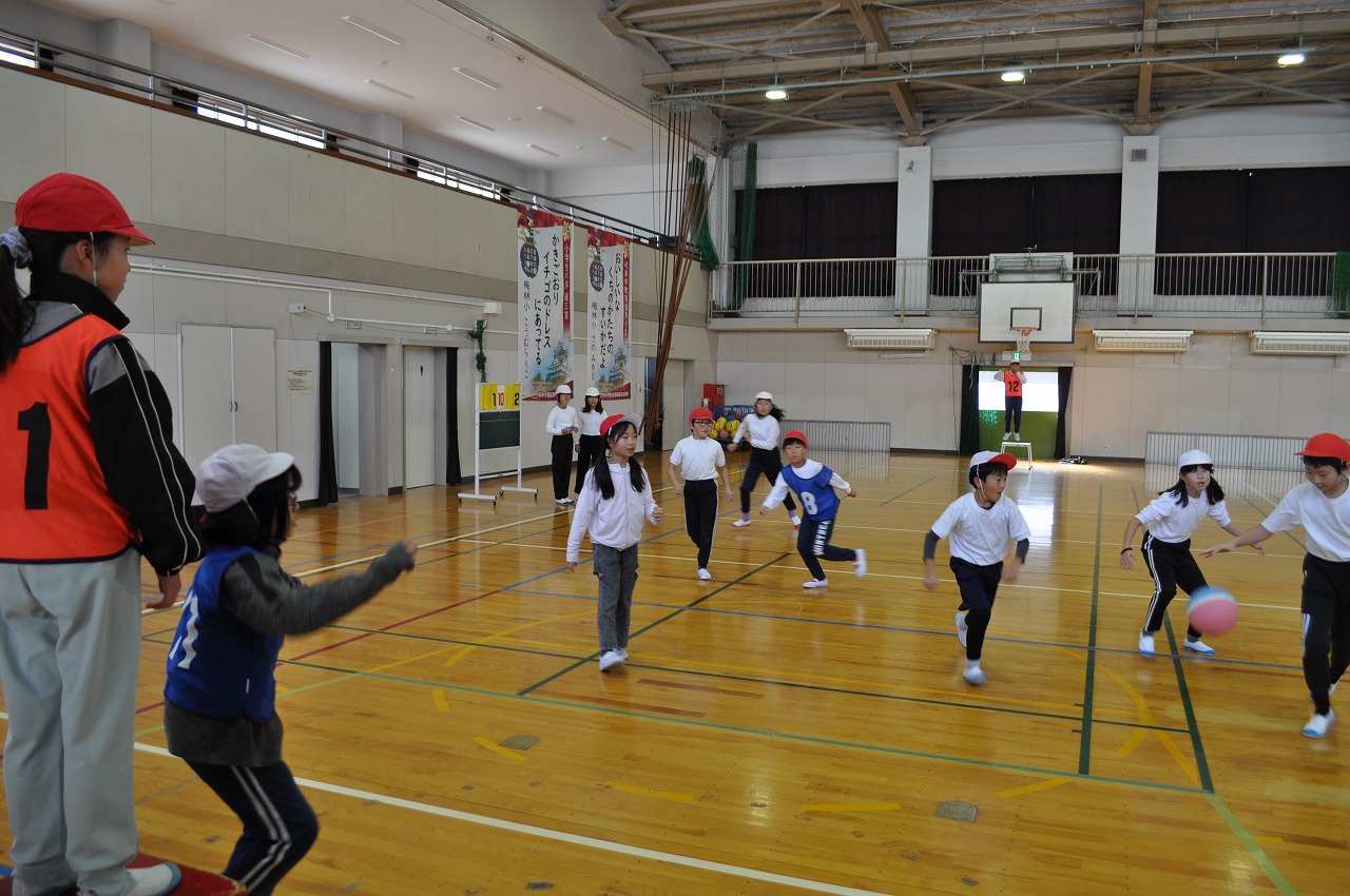 4年生体育「ポートボール」。パスをつなぎながらゴールマンが取りやすいボールを投げ込んでいました。