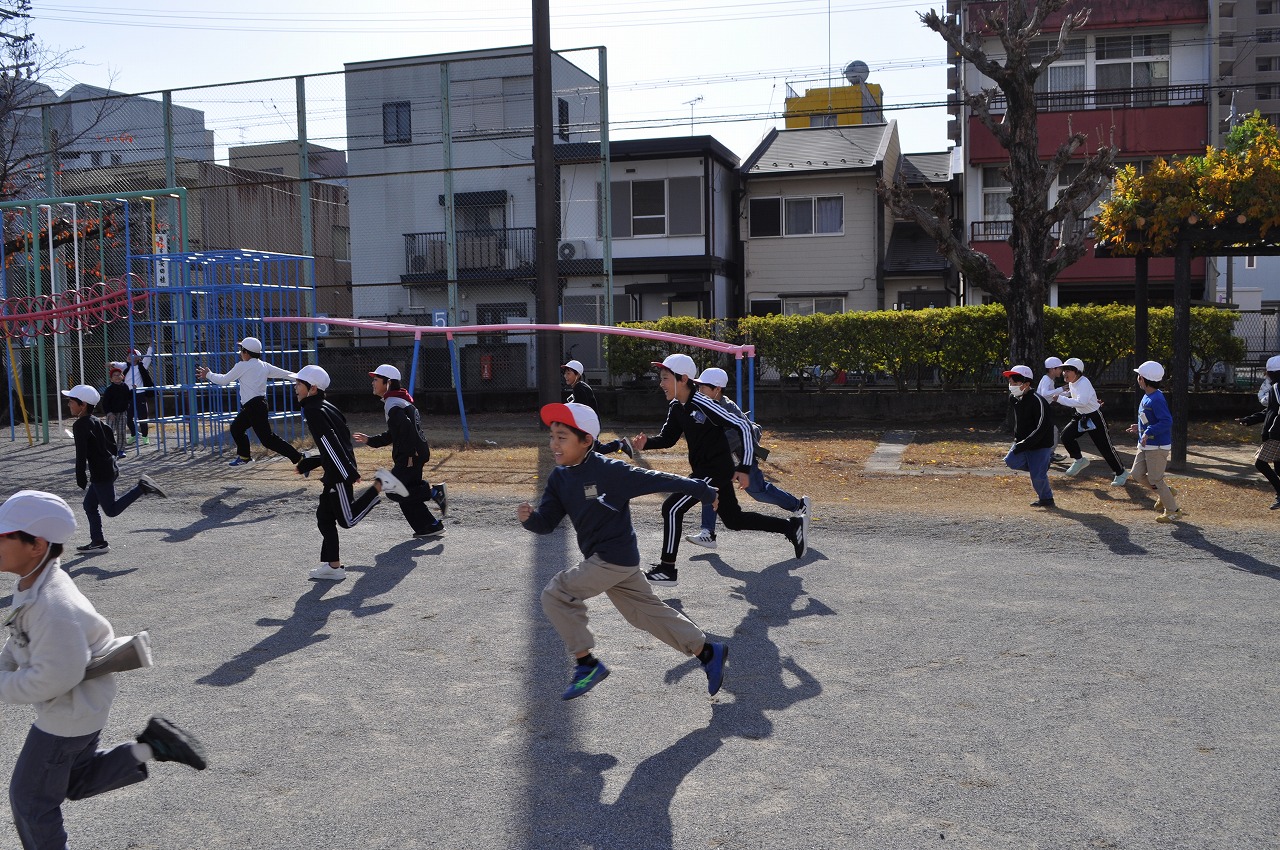 ハッピータイム、3年生と5年生が一緒に鬼ごっこをして遊びました。