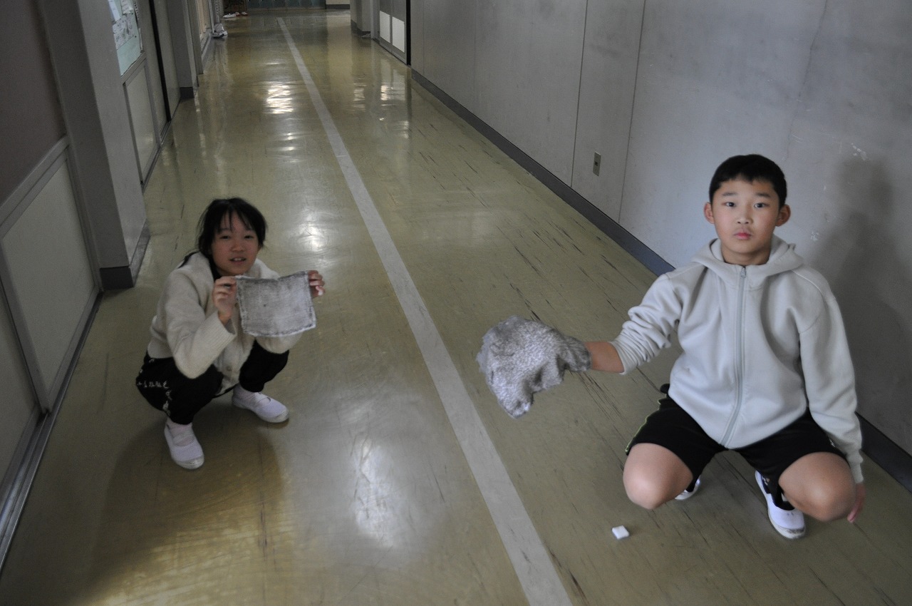 掃除時間、廊下の水拭きを6年生が熱心に行っていました。がんばった証が雑巾の汚れに現れています。