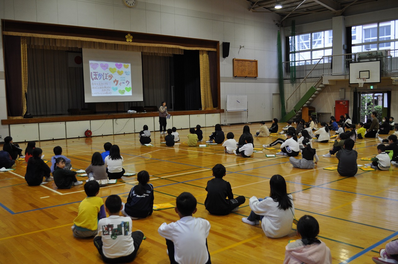 人権について考える「ぽかぽかウィーク」の取組の一つとして、毎年行っている「ひびきあい集会」を行いました。今年の集会は『キラぽかトーク』と題して、自分の「キラリ!」と光る部分を話しました。全学年の出席番号が(ほぼ)同じ子がグループをつくり、自分の「キラリ!」を話し、聞き手は感想を伝えます。