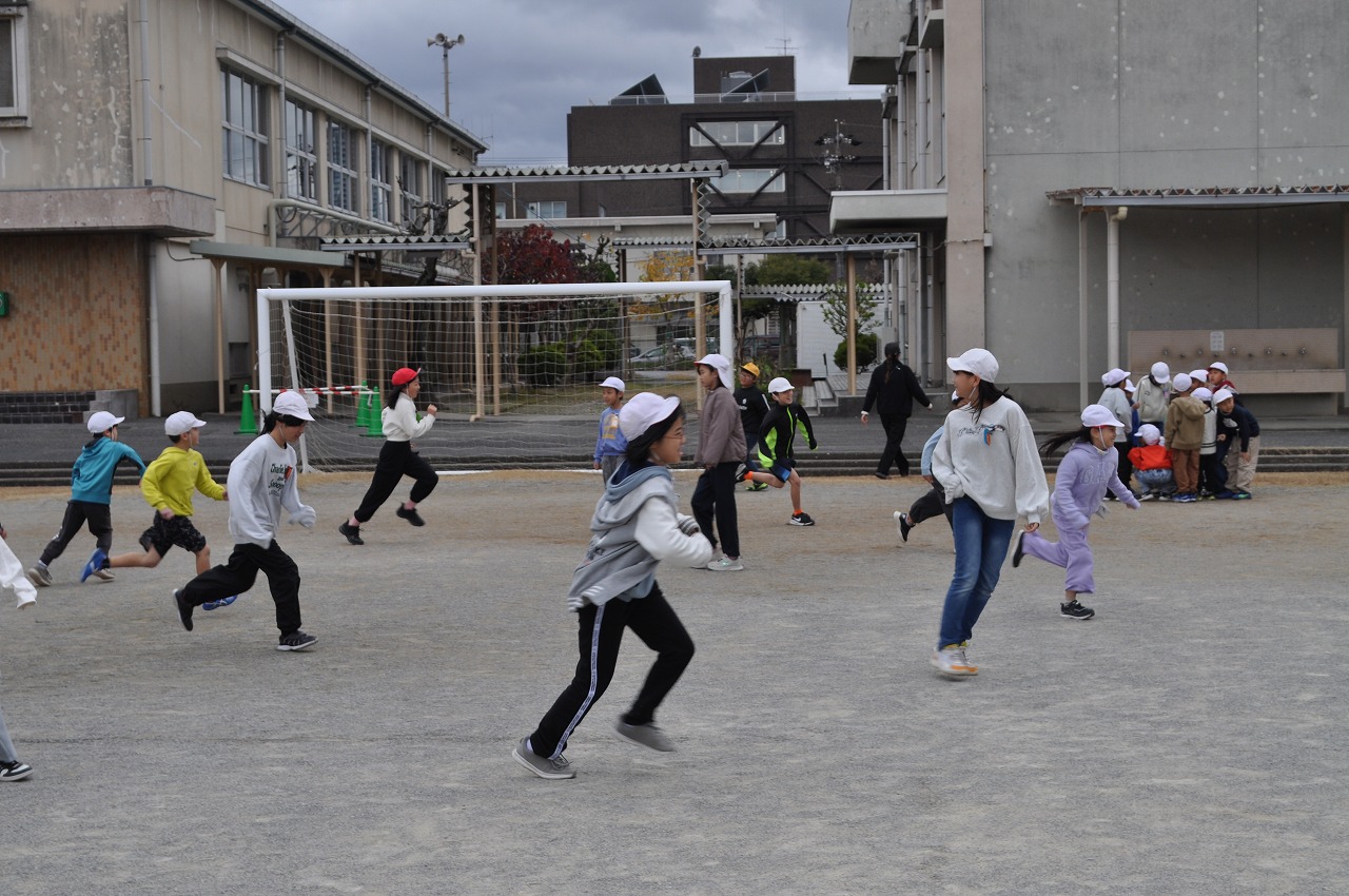 冷たい風がふきすさぶ中、ハッピータイムは多くの学級が鬼ごっこを楽しんでいました。走り回って身体が温まりますね。