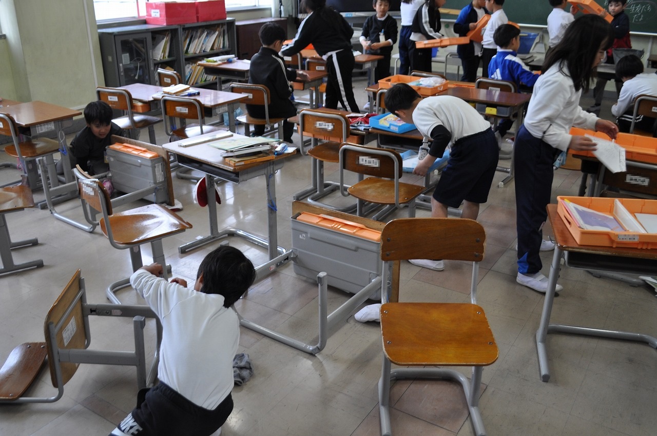 大そうじ名物、机の掃除です。机や椅子の脚や引き出しの中にたまった細かなごみを取っていきます。