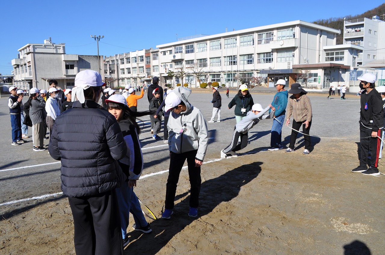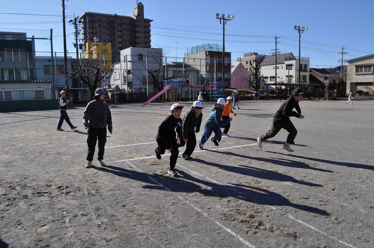 高学年の先生も子どもたちと一緒に走ったり跳んだりしていました。