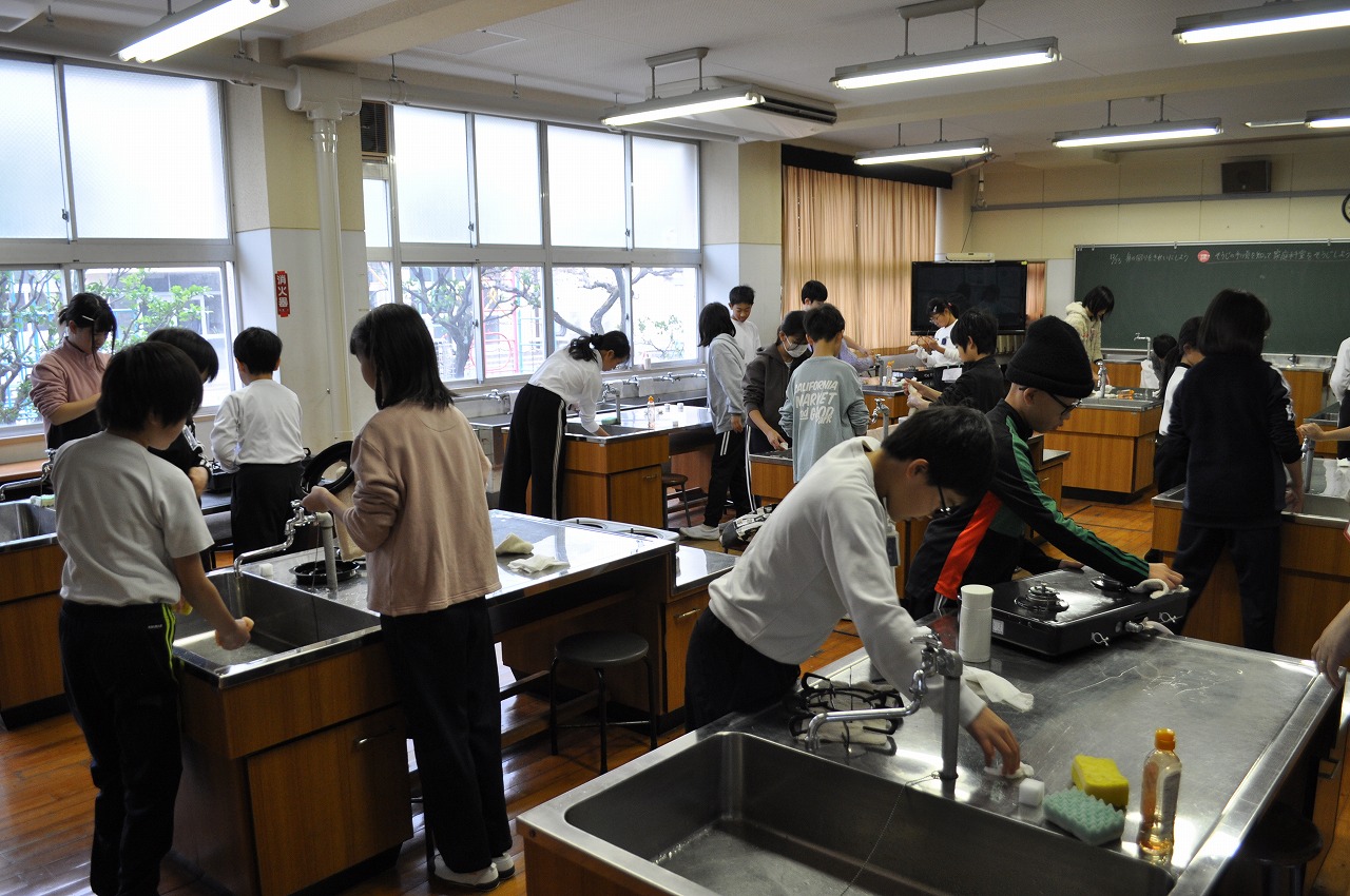 5年生家庭科。掃除も家庭生活を豊かにするために大切なスキルです。今日は手順を学習して、実際に家庭科室の調理台やコンロをきれいにしました。