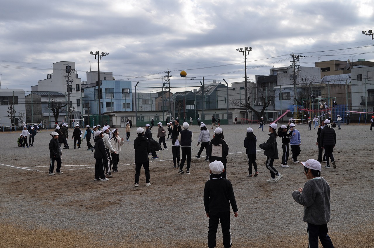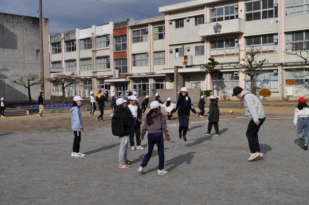 体育で短縄跳びが始まりました。先生も一緒に縄跳びで遊んでいます。